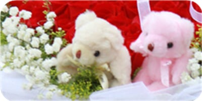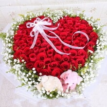 花 材99枝紅玫瑰,滿天星、黃鶯外圍,2個情侶小熊