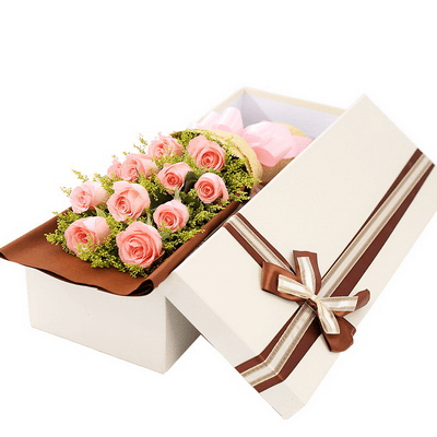 包 裝咖啡色皺紋紙單面包裝,淺色麻網(wǎng)托底,花結(jié)束扎,置于長方形禮盒中