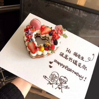 愛心水果蛋糕,巧克力胚子或(原味胚子上面撒可可粉),加水果、巧克力裝飾,配大蛋糕底盤+文字