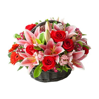 花 材11朵紅玫瑰、6枝多頭粉百合、11朵扶郎花,手提花籃 綠葉等配花填充豐滿