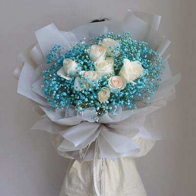 8枝白玫瑰,藍(lán)色滿天星混搭花束