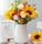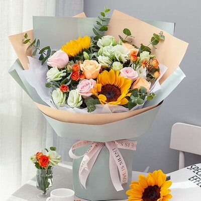 花 材3支粉玫瑰、3支香檳玫瑰、2支向日葵,搭配適量的桔梗、尤加利葉等
