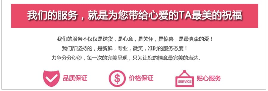 2、由于鮮花的季節(jié)性和供貨渠道變化性較強,可能您選擇的某種花材無法供應,對于非主要花材,我們在盡量不影響您所選的鮮花效果的情況下,按照寓意相同、類似花材、價值相同替代原則代替,對于主要花材,我們將在征求您的意見后進行處理,希望您能諒解;