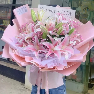 花 材8支多頭粉色百合,粉色滿天星間插