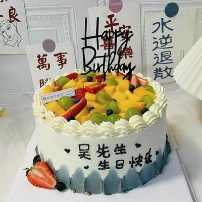 內(nèi)層蛋糕胚+新鮮奶油疊加,新鮮果肉夾層,表層奶油,時令水果,HappyBirthday插件等裝飾