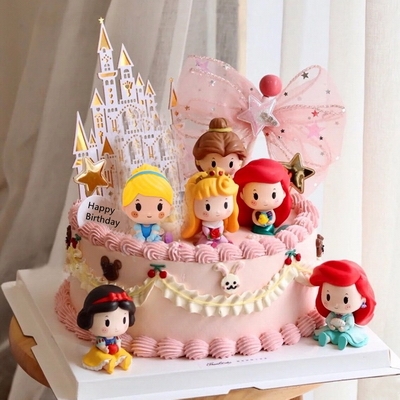 當(dāng)天新鮮制作蛋糕胚,中層新鮮水果夾心,表層甜美蝴蝶結(jié),白雪公主配件,城堡等裝飾