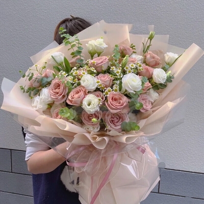 包 裝淺咖色珠光紙多層多角包裝,透明玻璃紙外圍,粉色緞帶花結(jié)束扎