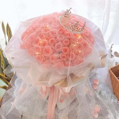 花 材99支粉玫瑰,1頂珍珠皇冠,1條彩燈搭配