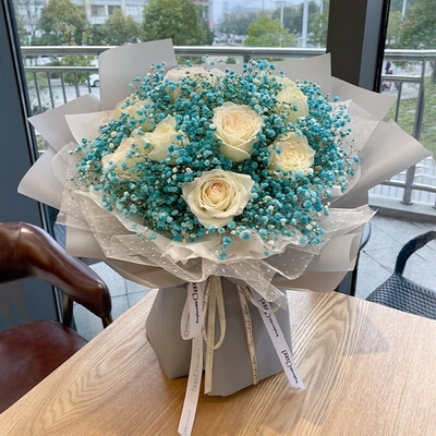 花 材11支白玫瑰,藍色滿天星豐滿