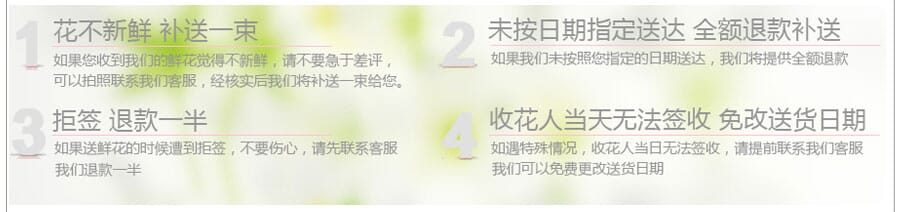 1、我們可以保證送到您手中時(shí)鮮花是新鮮的,請(qǐng)收花人在收到后務(wù)必立刻進(jìn)行鮮切花的保鮮處理,以免造成花材脫水,如果收花人已經(jīng)簽收,并且在12小時(shí)內(nèi),沒有提出異議,表明此定單我們已經(jīng)完成。