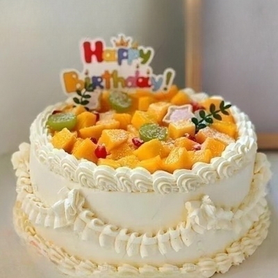 內(nèi)層新鮮蛋糕胚,新鮮水果夾心,表層時(shí)令水果、奶油裱花等裝飾