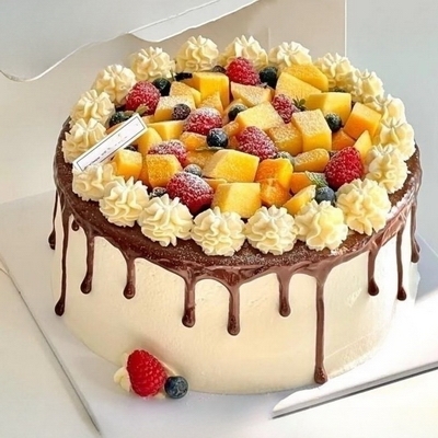內(nèi)層蛋糕胚+優(yōu)質(zhì)奶油疊加,水果果肉夾層,表層奶油裱花,芒果,藍(lán)莓,草莓等裝飾,側(cè)邊巧克力醬淋面