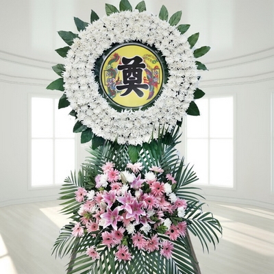 花 材白菊,粉色弗朗,粉色百合,散尾葵,雙層悼念花籃
