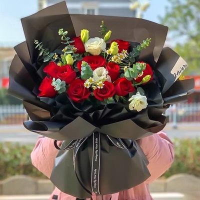 花 材11枝紅玫瑰,洋桔梗、洋甘菊、尤加利葉搭配
