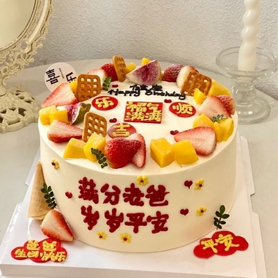 爸爸主題水果蛋糕,各種時(shí)令水果等圍圈,裱字“滿分老爸 歲歲平安”(可聯(lián)系客服改字),水果夾層