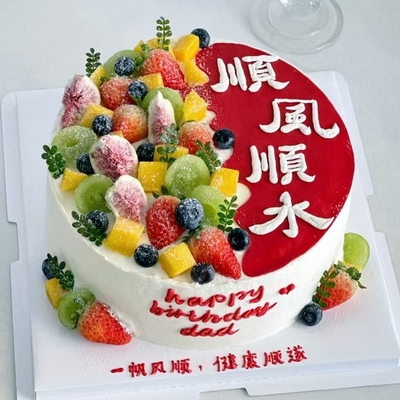 圓形水果蛋糕,新鮮水果夾層,時(shí)令水果、果干、奶油裱字裝飾
