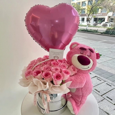 33枝粉玫瑰草莓趴趴熊 (貨號(hào):SZS-54208)